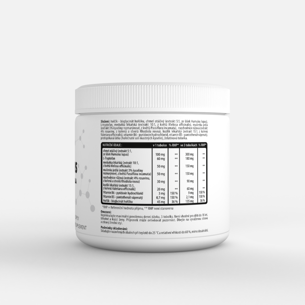 Magnesium – Magnesiumbisglycinat, Hopfen (Extrakt 5:1, aus Humulus lupus-Zapfen), L-Tryptophan, Zitronenmelisse (Extrakt 10:1, aus Blüten von Melissa officinalis), Passionsblume (Extrakt 3 % Rosmarinsäure, aus Blüten von Passiflora incamata), Rhodiola rosea (Extrakt 4 % Rosavin, aus Wurzeln und Stängeln von Rhodiola rosea), Baldrian (Extrakt 15:1, aus den Wurzeln von Valeriana officinalis), Vitamin B6 – Pyridoxinhydrochlorid, Vitamin B5 – Calciumpantothenat, Trennmittel (Magnesiumsalze von Fettsäuren), Gelatinekapsel.