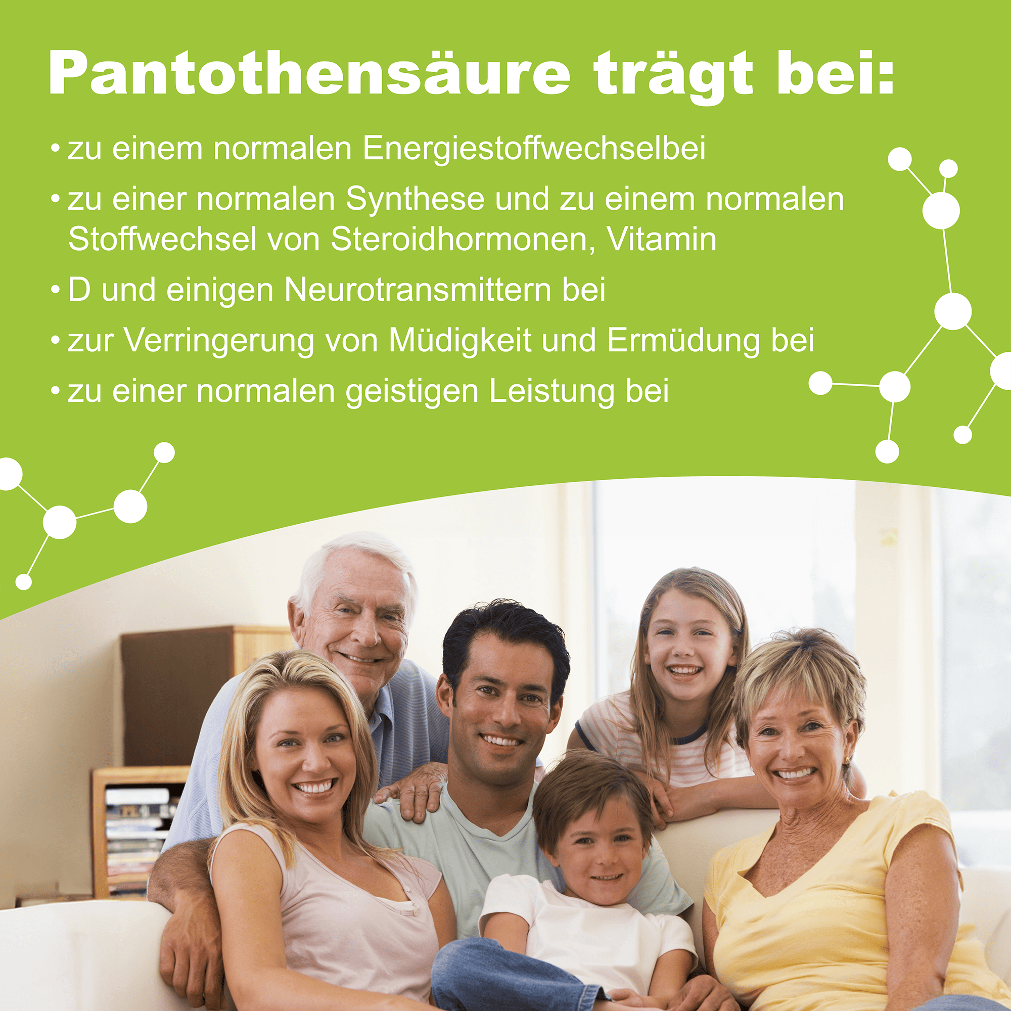 Vitamin B5 (Pantothensäure, D-Pantothensäure) ist ein wasserlösliches Vitamin, das der Körper nicht selbst herstellen kann. Vitamin B5 trägt zur Verringerung von Müdigkeit und Erschöpfung sowie zu einem normalen Energiestoffwechsel bei (es ist an der Verwertung von Fetten, Kohlenhydraten und Proteinen beteiligt). Es ist entscheidend für die Bildung von Coenzym A, das eine zentrale Rolle im Fettsäurestoffwechsel und bei der Synthese von Steroidhormonen, Vitamin D und Neurotransmittern spielt.